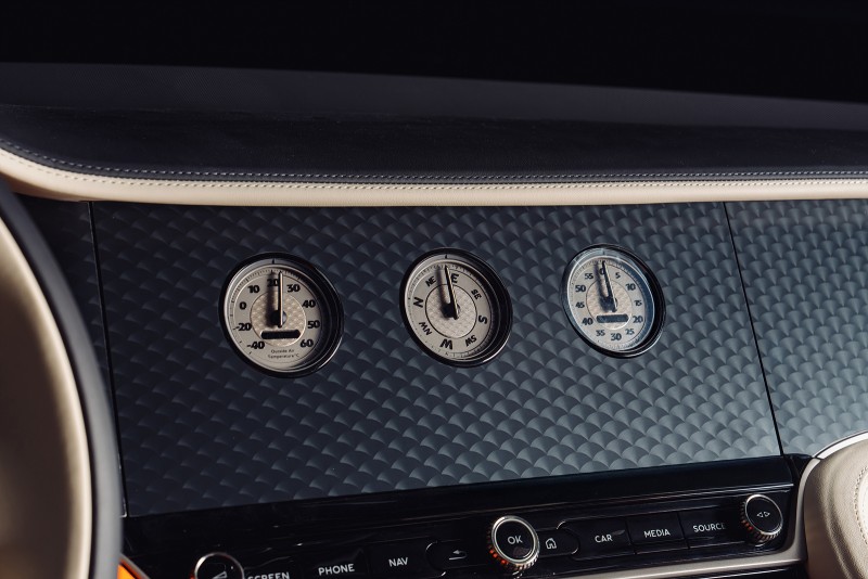 바투르 컨버터블은 벤틀리 역사상 가장 강력한 740마력 W12 엔진의 성능을 강조하는 데 집중했다. 은은한 실버 컬러의 차체는 검정색 바투르 레이싱 스트라이프가 가로지르고, 그 양옆에는 만다린 핀 스트라이프가 정교하게 그려져 있다. 이 스트라이프는 라디에이터 그릴에서 시작해 보닛, 오픈탑의 에어브리지, 후면 덱까지 차체를 따라 이어지며, 톤노 커버에도 같은 패턴이 자수로 재현된다. 전면 그릴은 벨루가 컬러에 만다린 포인트가 들어갔고, 휠 또한 동일한 색 조합으로 마무리됐다.