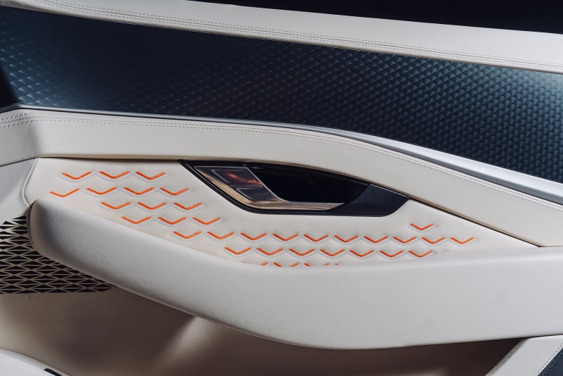 반면, 동승석은 린넨 컬러 가죽과 알칸타라로 마감돼 부드럽고 밝은 분위기를 연출한다. 같은 바투르 패턴도 배경색만 바뀌었을 뿐 동일하게 적용된다. 뒤편의 수납 공간 역시 운전석과 동승석 각각의 컬러 테마에 맞춰 양쪽이 다르게 꾸며졌고, 키 케이스와 안전벨트까지 색상이 맞춰졌다.