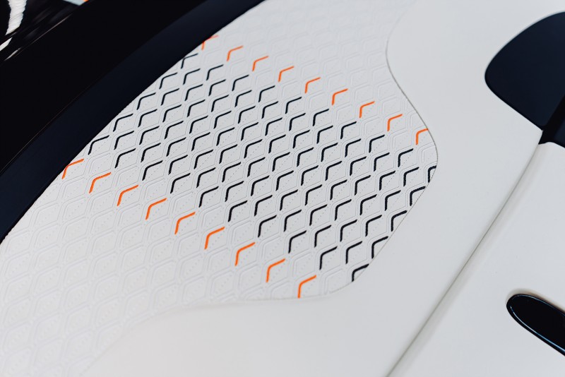실내는 클래식 레이싱카에서 영감을 받았지만, 구성은 철저히 현대적이다. 운전석과 동승석은 시각적으로 완전히 분리된 디자인이다. 운전석은 벨루가 블랙과 알칸타라 마감, 시트 볼스터와 도어 인서트에는 린넨과 만다린 색상으로 바투르 고유의 패턴이 들어간다. 센터 콘솔부터 계기판, 도어 하단까지 만다린 컬러의 가죽이 운전자를 감싸는 구조다.