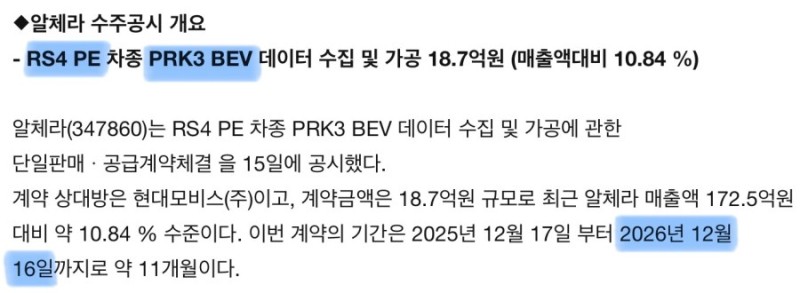 G90, 전기차 & 자율주행 3단계? 튜9 0 56 0 01.18 01:55 알체라 라는 국내 AI 회사가 모비스랑 계약했네요.PRK3 데이터 수집하는거 보니 자율주행 3단계 지원하려나요.BEV도 같이 테스트하나 봅니다.계약기간 만료일이 12월 16일인데 그 전에 출시하고 출시 후 테스트하겠죠? 0