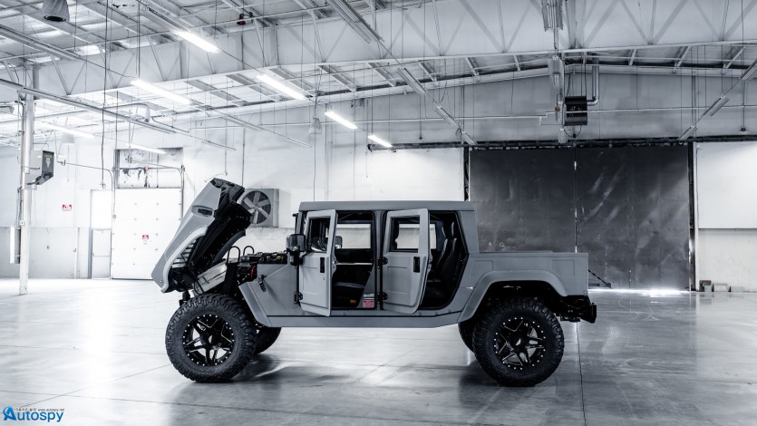 4인승 더블 캡 픽업 형태의 알루미늄 보디의 사이에 케블라 소재를 더해 포인트를 주었다. 당당한 외모는 20인치 휠에 38인치 오프로드용 타이어를 끼워 더욱 돋보인다.